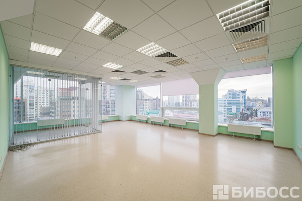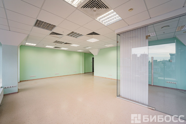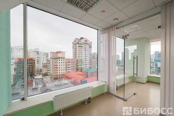 Общая площадь - 59,3 кв.м. в виде единого зала с отдельным кабинетом для руководителя/переговорной комнатой. Высокие потолки и эффектный панорамный вид на город.
