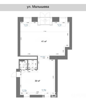 Площадь — 75 м². Два зала — 41 м² и 30 м² санузел и комната персонала.
