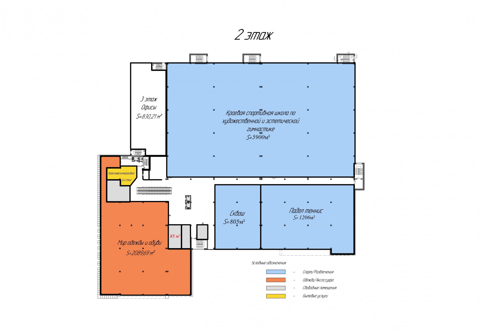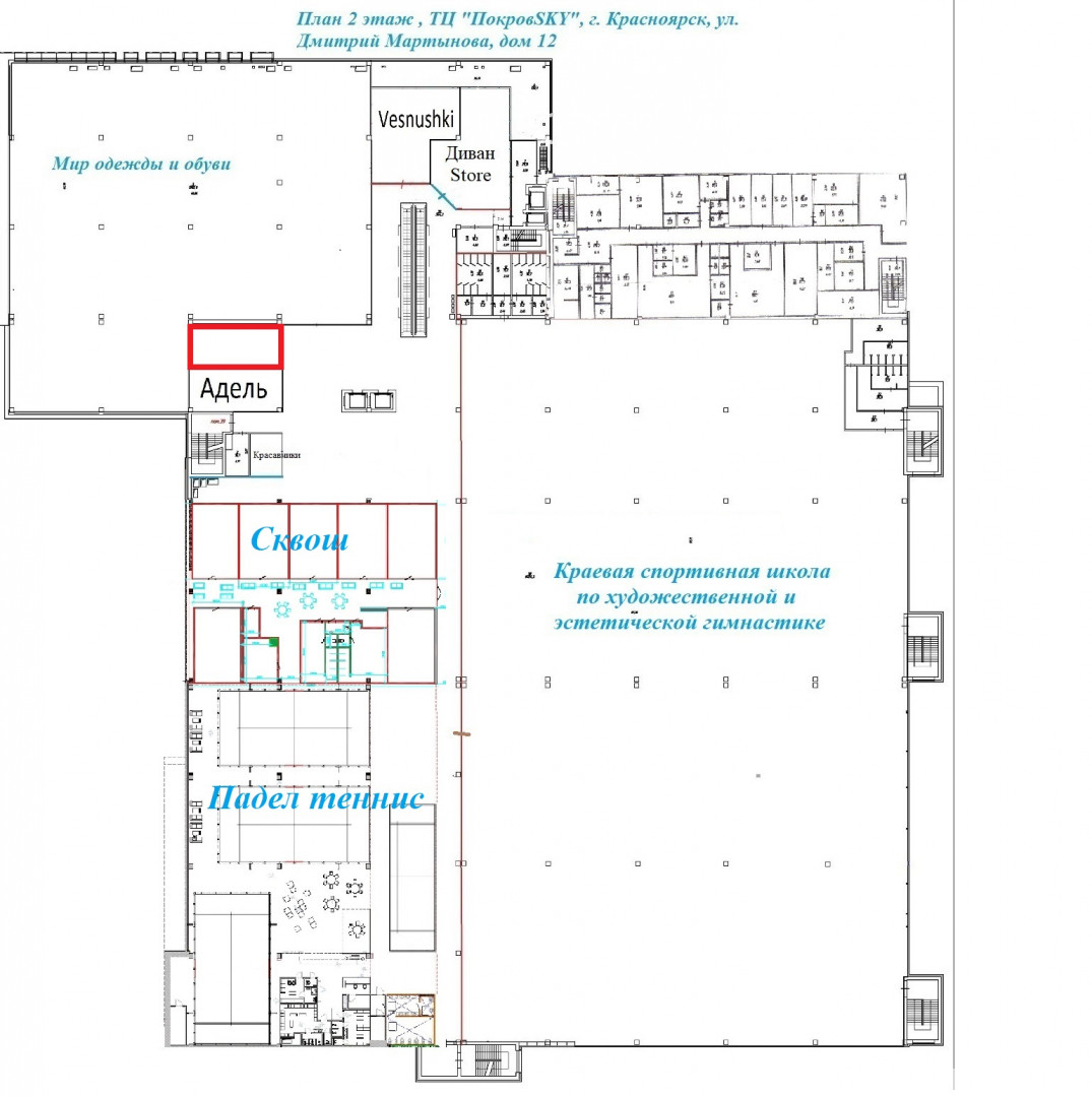 Высокий "голодный" трафик: Помещение находится на 2-м этаже, где расположены клубы падел-тенниса и сквоша, краевая спортивная школа гимнастики, Красноярскэнергосбыт. Ваши потенциальные клиенты (спортсмены, родители, отдыхающие) уже здесь каждый день!