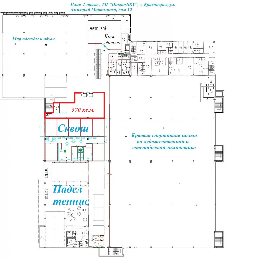 Сдается в аренду просторное помещение на 2-м этаже ТЦ «ПОКРОВSKY» (ул. Дмитрия Мартынова, 12). Площадь — 370 м2, потолки до 9 метров! Это идеальное пространство для реализации смелых идей: спортивный клуб (теннис/борьба/пиклболл), студия танца, шоурум, выставочное пространство, детский развлекательный центр.
