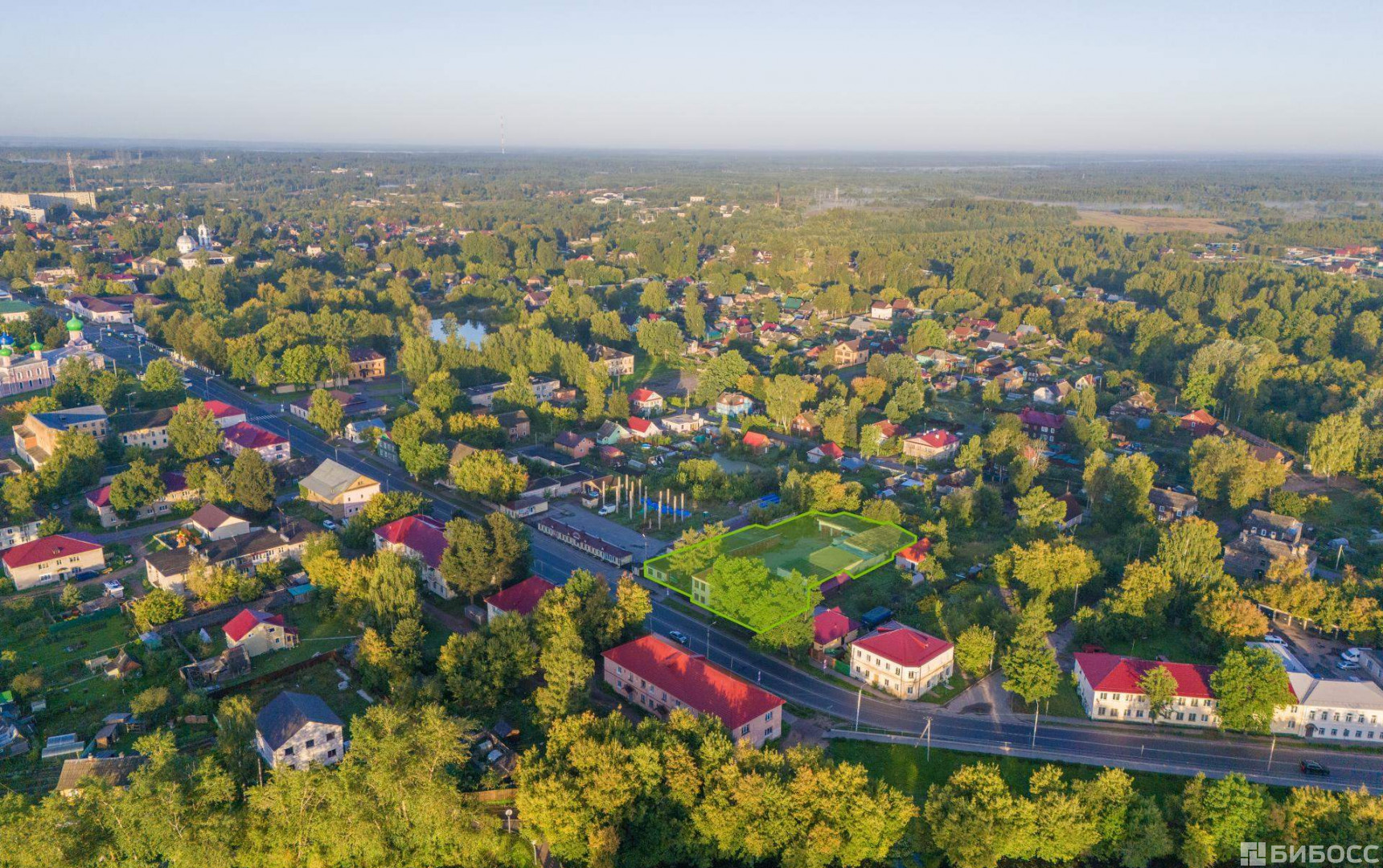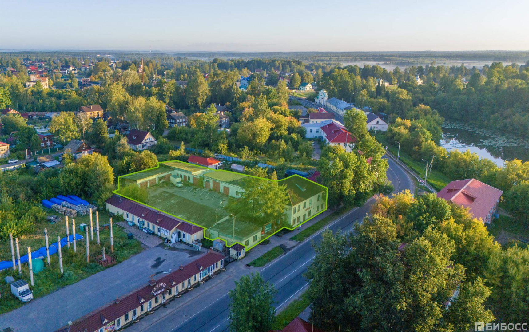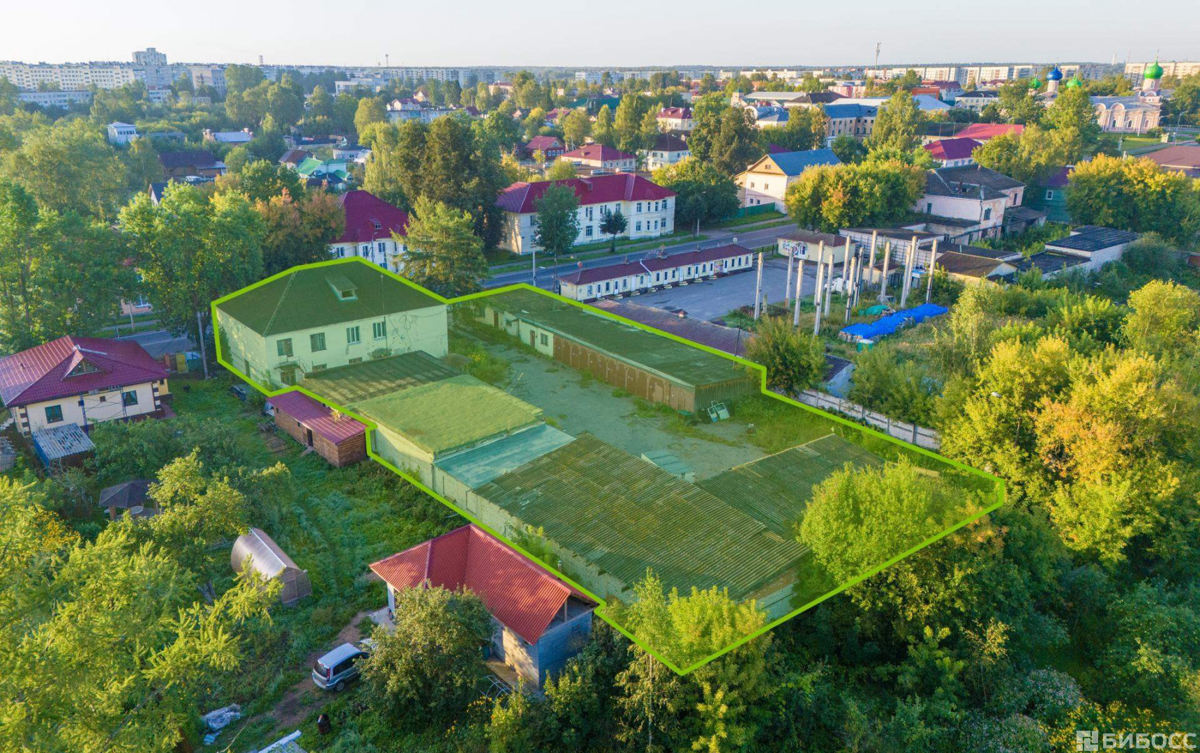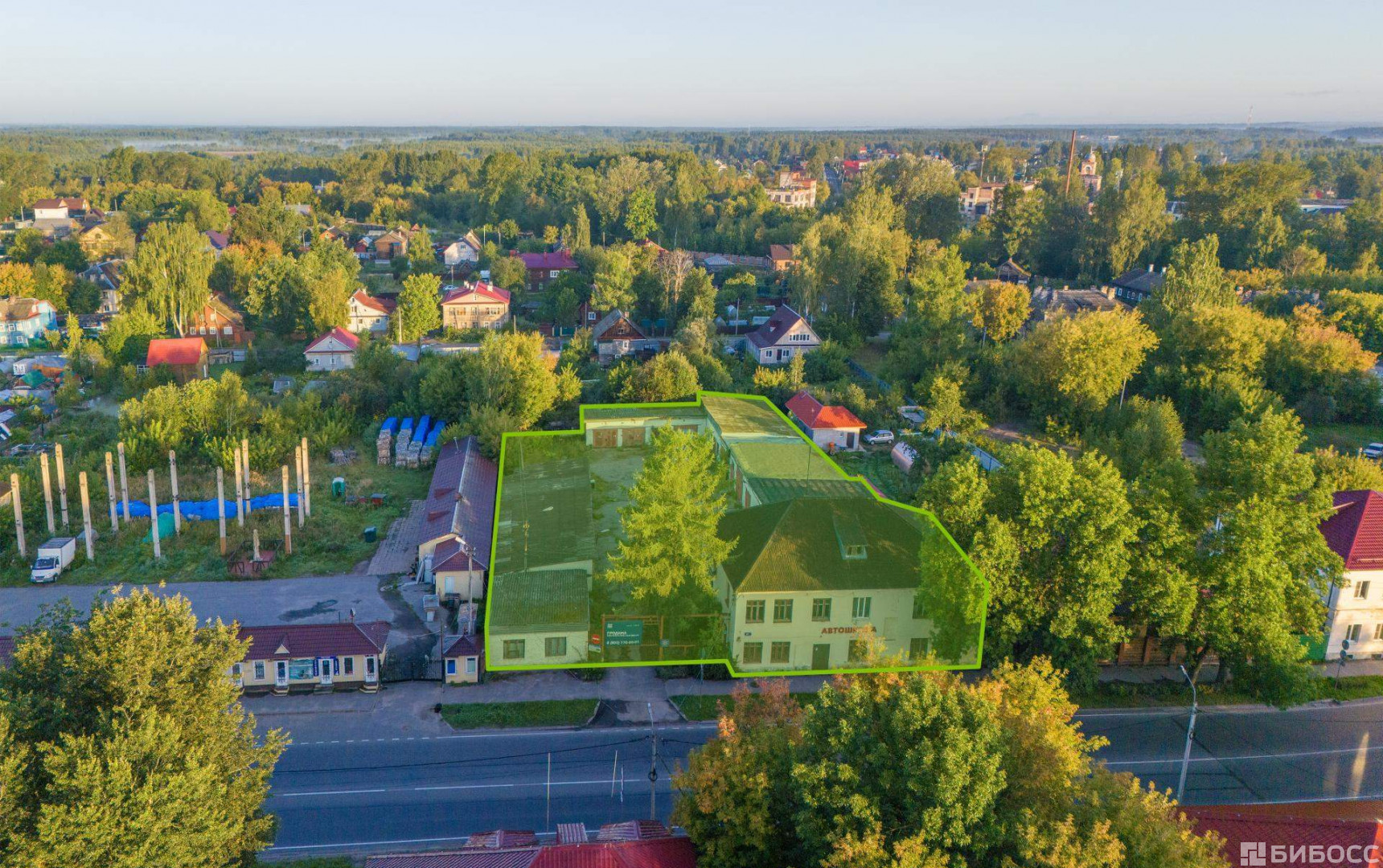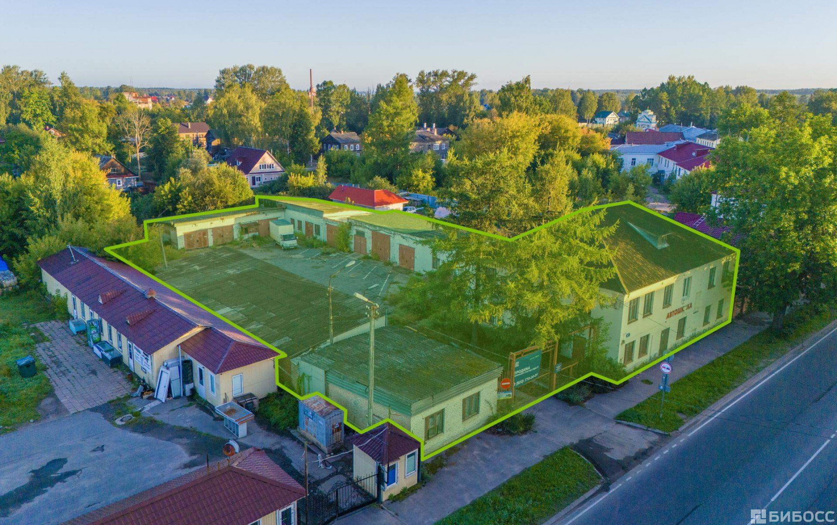 Объект расположен на 1й линии ул. Советская, в 5 минутах Захаровского парка. Участок правильной формы, имеется собственный съезд и выезд. Ближайшее окружение представлено коммерческой и жилой застройкой. На участке расположены два здания площадью 388,8 м2 и 64 м2, а также два гаража общей площадью 591,3 м2.