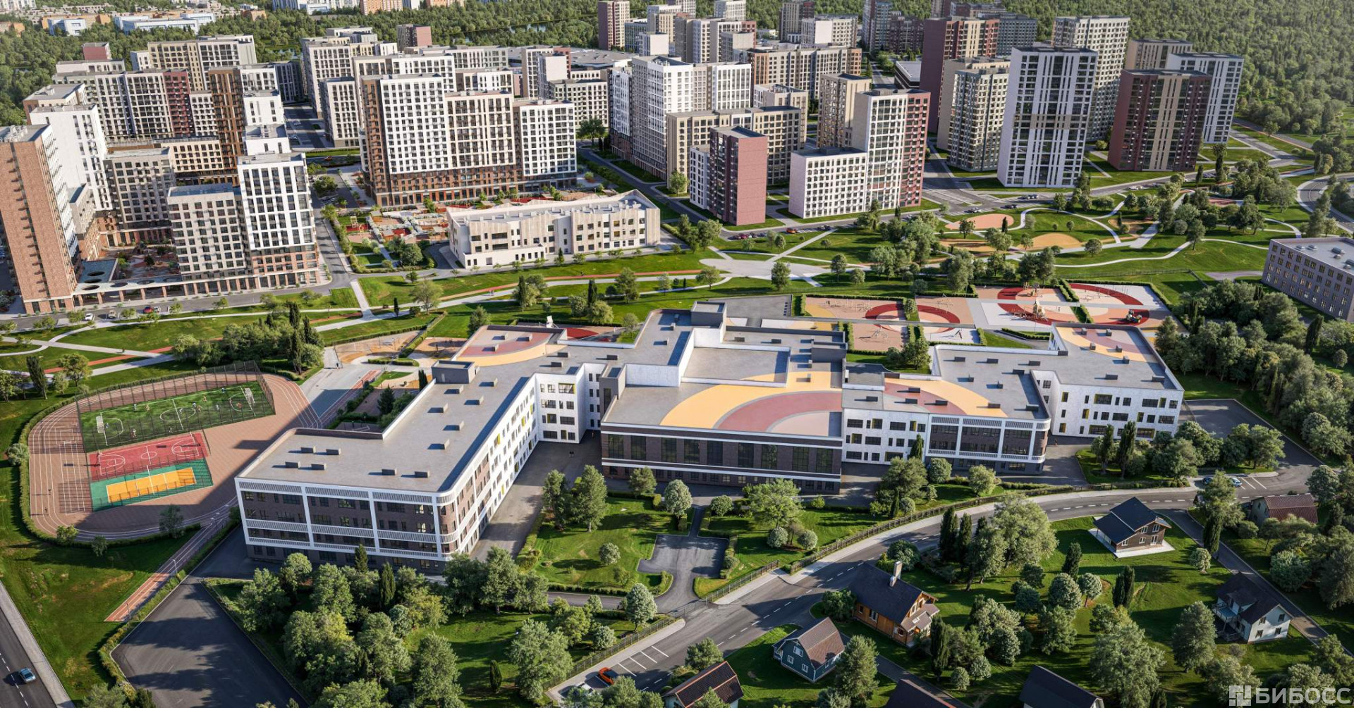 - Спортивная среда: закольцованный веломаршрут с навигацией, спортивный комплекс с термами, закрытый тренажерный зал и зоны ворк-аута