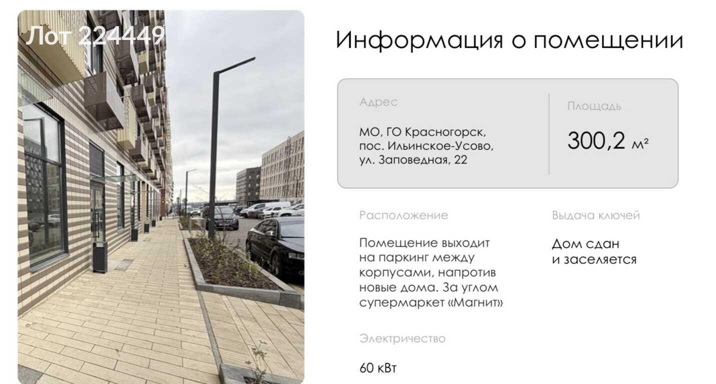 ==ЛОТ 224449 == ОТ СОБСТВЕННИКА, БЕЗ КОМИССИИ. Предлагаем в аренду коммерческое помещение свободного назначения общей площадью 300 м?, расположенное на первом этаже современного жилого комплекса "Ильинские Луга" по адресу: Заповедная улица, 22 в поселке Ильинское-Усово, городской округ Красногорск. Объект находится в активно развивающемся районе, где проживает более 30 тысяч человек. Высокий клиентский трафик обеспечивается соседством с популярным супермаркетом "Магнит". Помещение состоит из трех смежных частей с отдельными входами, что предоставляет возможность для реализации различных бизнес-идей — от медицинских учреждений до торговых точек и офисов. Высокие потолки (4,72 м) и большие витринные окна создают просторную атмосферу, а места для размещения рекламы на фасаде привлекают внимание прохожих. В 2029 году откроется станция метро "Ильинская", что дополнительно увеличит поток клиентов. Все необходимые коммуникации, включая центральное отопление и кондиционирование, уже предусмотрены. Эти характеристики делают помещение идеальным для долгосрочной аренды. Удобное расположение в 10 км от МКАД и близость к таким популярным местам, как парк "Ильинские Луга" и другие объекты инфраструктуры, обеспечивают легкий доступ как для клиентов, так и для сотрудников. Ключи от помещения уже получены, и оно готово к проведению ремонтных работ.