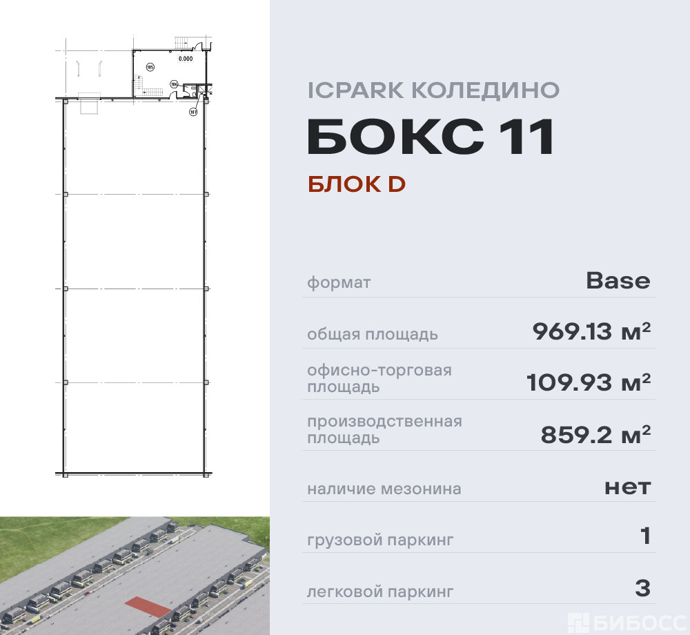 Планировочное решение включает в себя пространство для производства, склад или логистику 859,2 кв.м, а также офисную часть 109,93 кв.м.