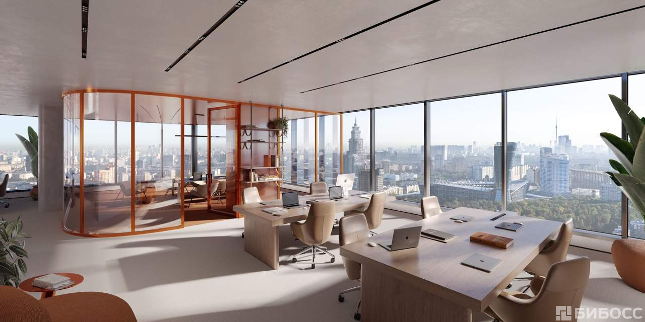 Здание класса А, этаж 5 из 33, просторный современный офис под чистовую отделку, открытая планировка, витринные окна, высота потолков 3,6 м.