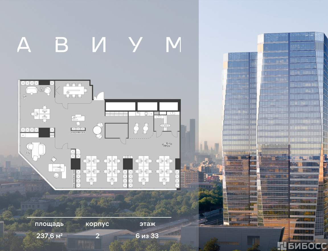 Продажа премиальных офисов в бизнес центре Авиум. Две 34-этажные башни, объединённые галереей и дочерним корпусом.