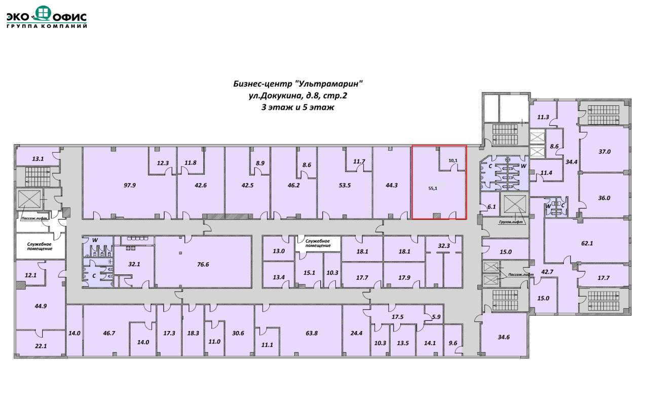 3 этаж, 8-этажное здание. Помещение с окнами: зал 55.1 м и кабинет 10.1 м.
