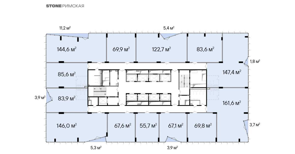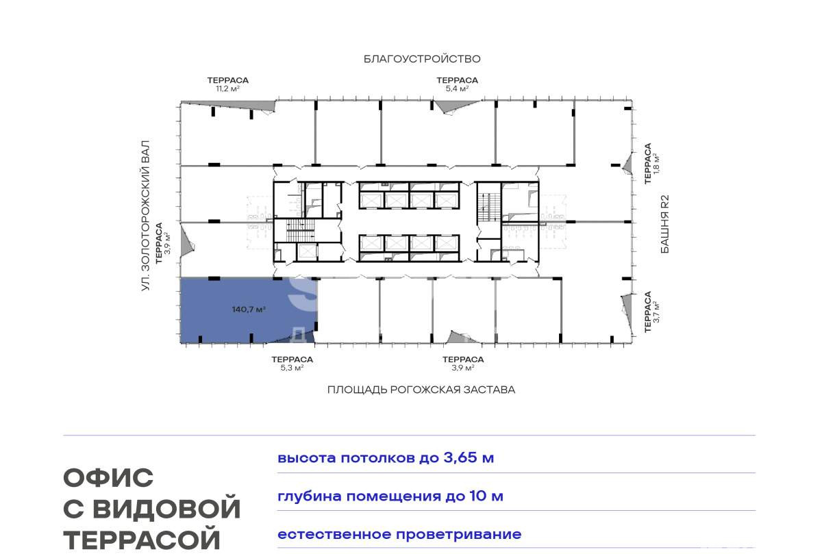 Планировки соответствуют требованиям функционального офиса: глубина помещения - до 10 м, высота потолков - 3,65 м, шаг колонн - 8,4 х 8,4 м, отделка Shell&Core. Окна в пол обеспечат оптимальный уровень инсоляции и предусматривают возможность естественного проветривания.