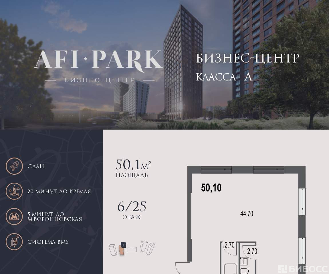Продается просторное коммерческое помещение общей площадью 50,1 на 6 этаже в готовом бизнес-центре AFI Park. Строительство комплекса завершено.