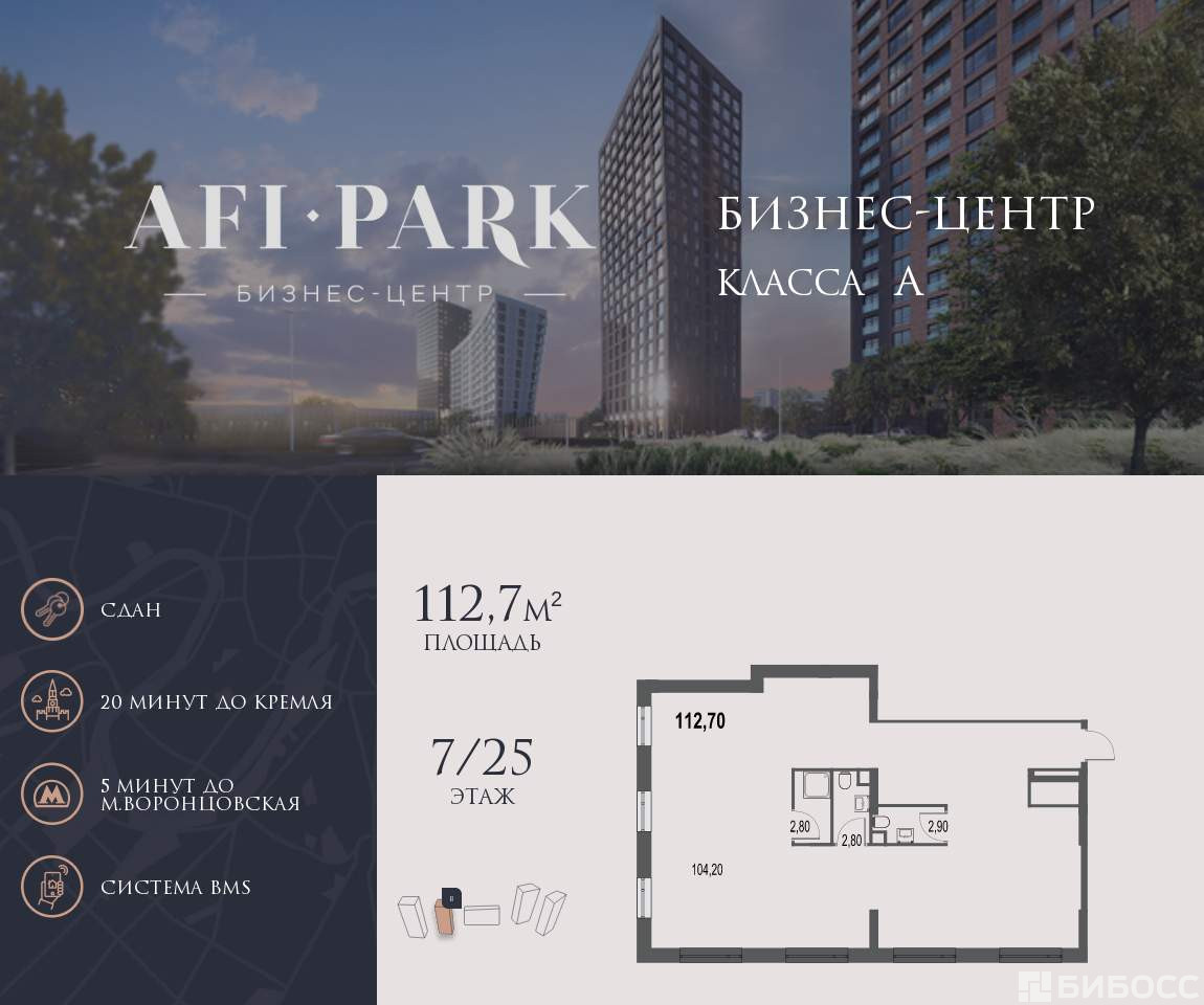 Продается просторное коммерческое помещение общей площадью 112,7 на 7 этаже в готовом бизнес-центре AFI Park. Строительство комплекса завершено.