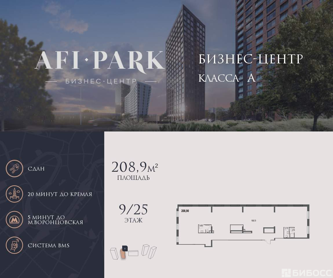 Продается просторное коммерческое помещение общей площадью 208,9 на 9 этаже в готовом бизнес-центре AFI Park. Строительство комплекса завершено.