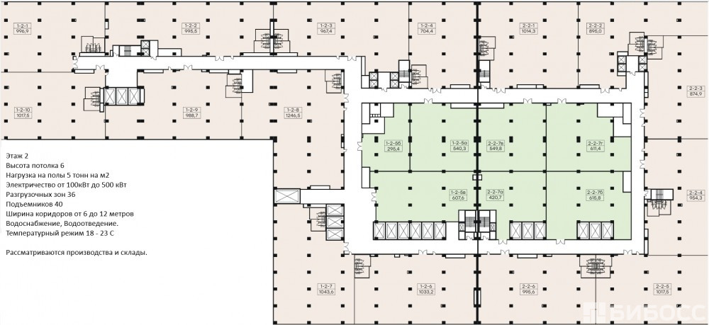 На этаже предусмотрены: 18 промышленных лифтов, один многотонный суперлифт, 36 погрузочно-разгрузочных доков.