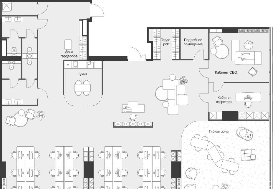- Пространства без колонн в углах, идеально подходят для руководителей и современных команд.