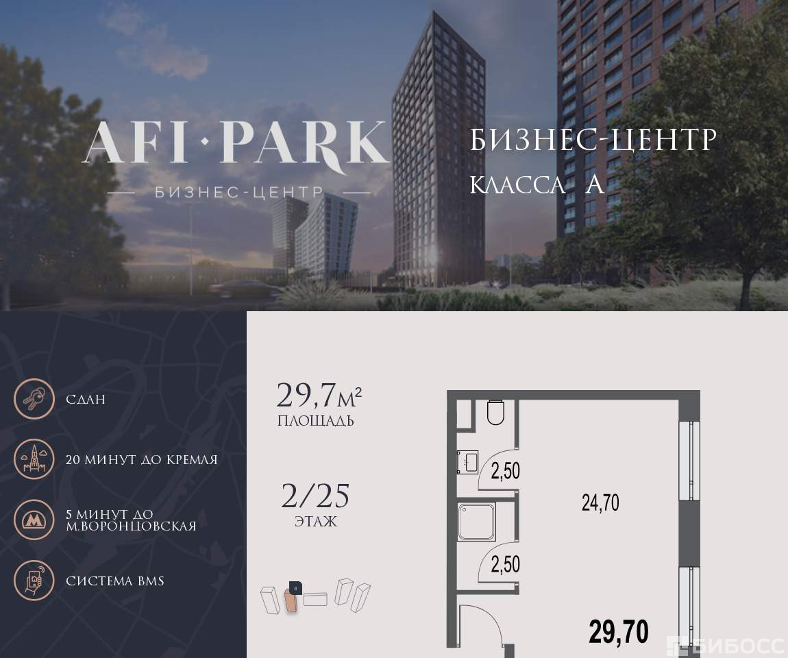 Продается просторное коммерческое помещение общей площадью 29,7 на 2 этаже в готовом бизнес-центре AFI Park. Строительство комплекса завершено.