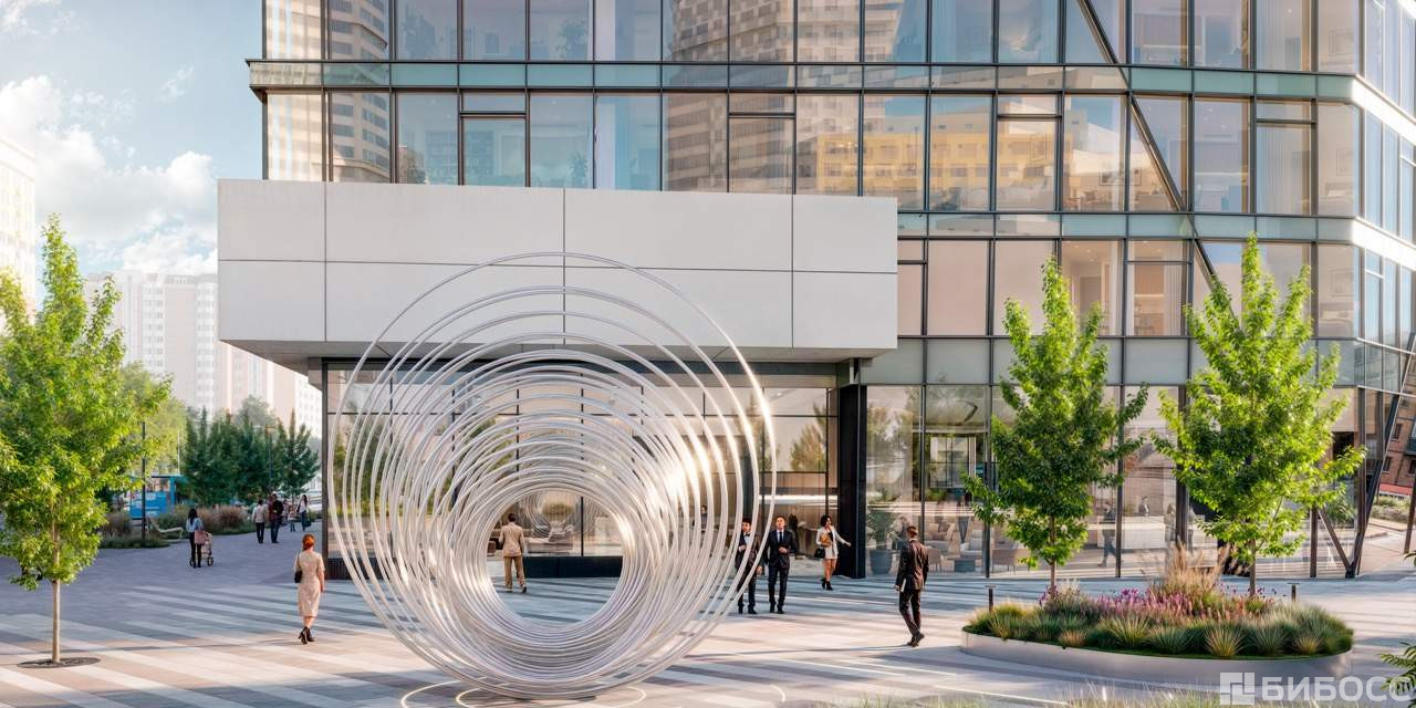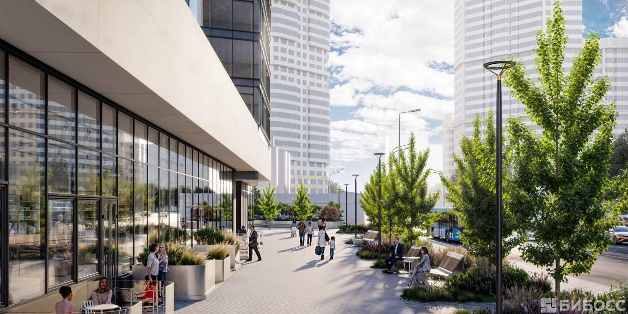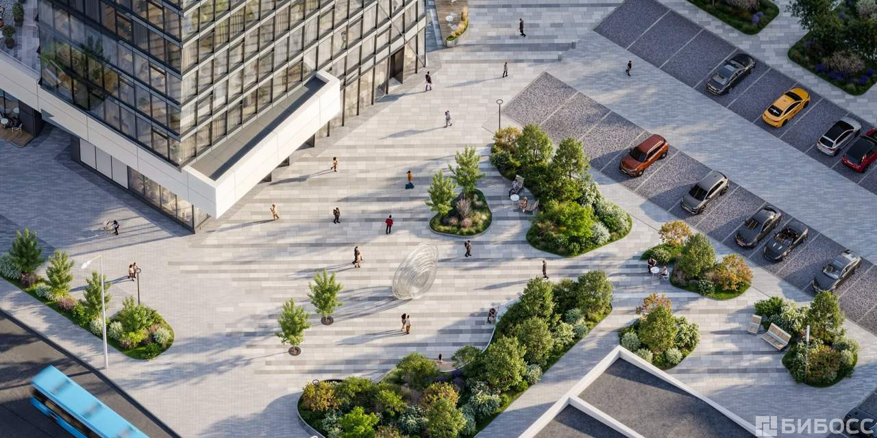 В центре - просторная встречающая площадь, рассчитанная на большой пешеходный поток. Пространство открытое, понятное: в нем легко ориентироваться и удобно назначать встречу у знакового арт-объекта.