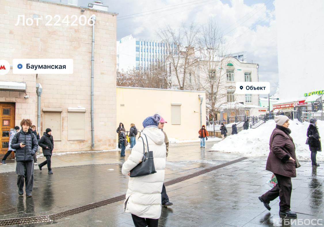 ==ЛОТ 224206 == ОТ СОБСТВЕННИКА, БЕЗ КОМИССИИ. Предлагается на продажу коммерческая недвижимость, расположенная по адресу: улица Бауманская, Центральный административный округ города Москвы.Объект находится в непосредственной близости от станции метро «Бауманская», до которой можно добраться менее чем за одну минуту пешком.В районе наблюдается интенсивное автомобильное и пешеходное движение, что обеспечивает высокую проходимость и хорошую транспортную доступность.Помещение обладает значительным рекламным потенциалом, предоставляя возможности для размещения рекламных вывесок и других информационных носителей.