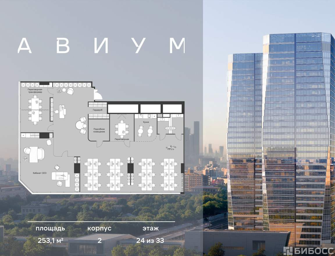 Продажа премиальных офисов в бизнес центре Авиум. Две 34-этажные башни, объединённые галереей и дочерним корпусом.