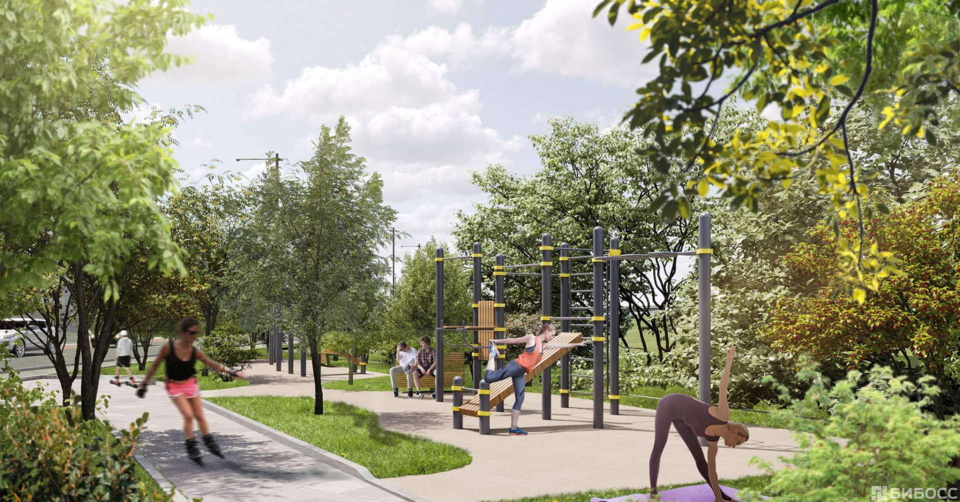 Весь микрорайон спроектирован в концепции "без машин". Пейзаж не портят припаркованные автомобили, а родители могут не опасаться за перемещение детей по всему кварталу.