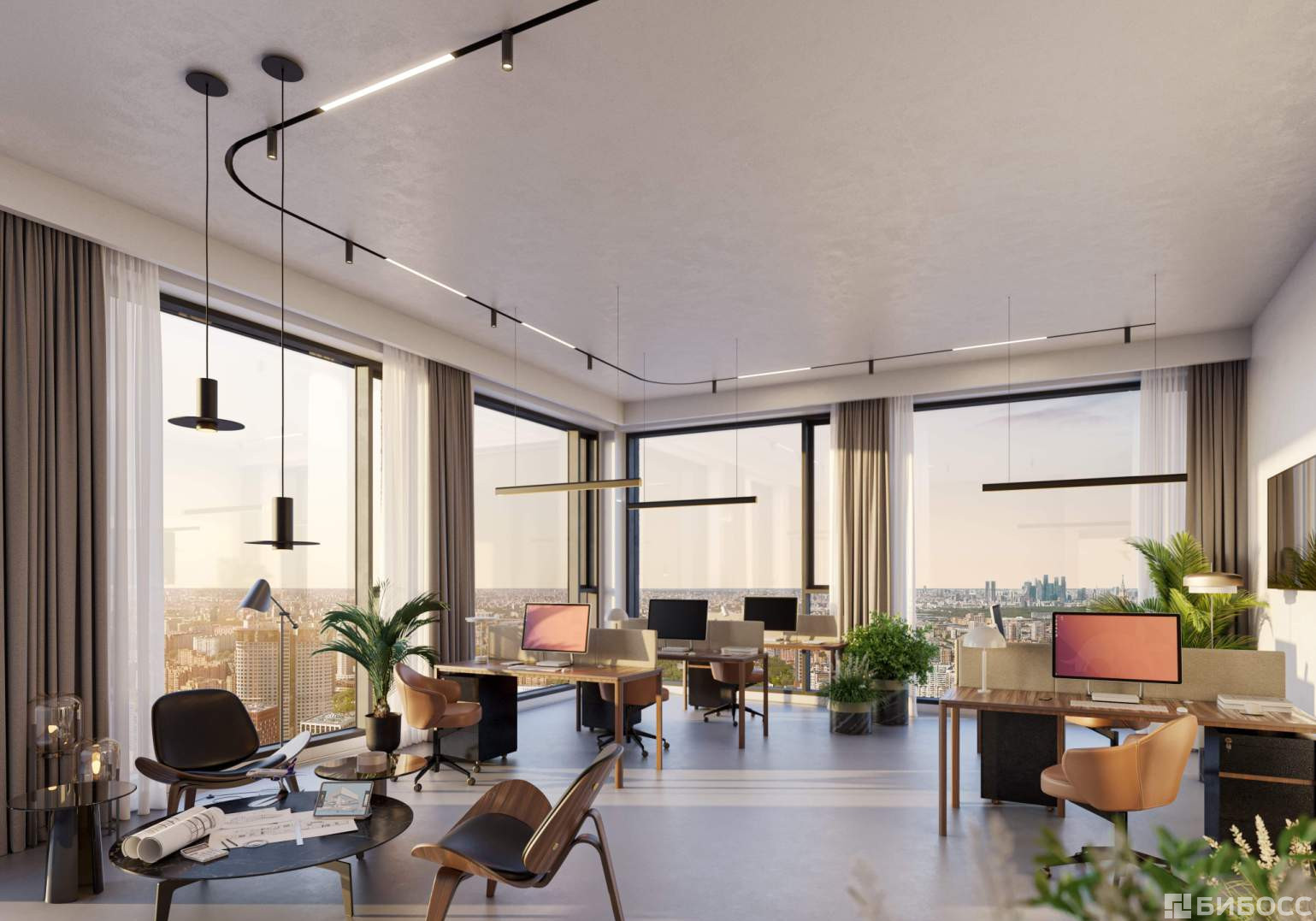 За счет неглубокой посадки офисов и панорамного остекления все помещения хорошо освещаются естественным образом. Из окон открывается панорамный вид на город и