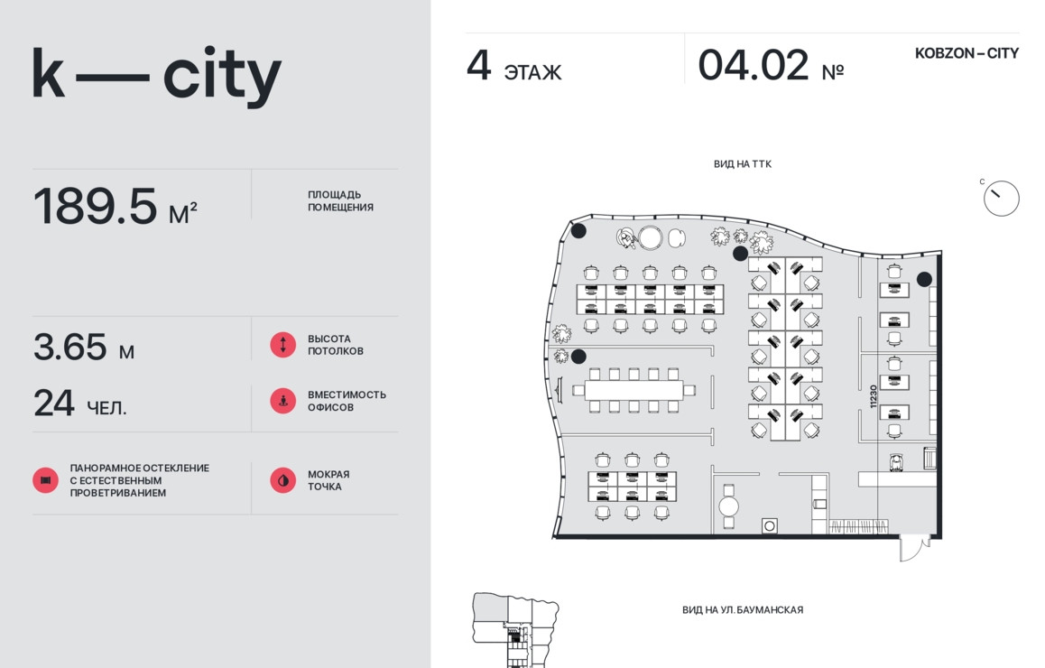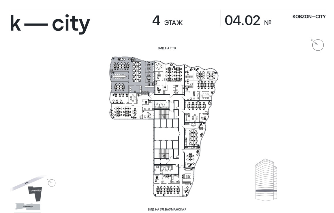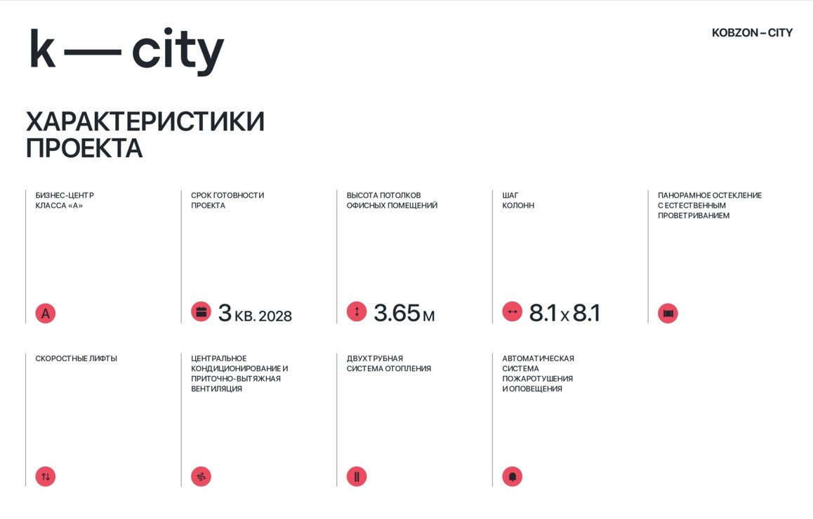 Объект занимает 4 этаж в бизнес-центре класса «А» KOBZON-CITY. Высота потолков составляет 3,65 м. Панорамное остекление с естественным проветриванием. Помещение без отделки. Планировка: свободная. Срок передачи Помещения в собственность Покупателя – 2 квартал 2029 г.