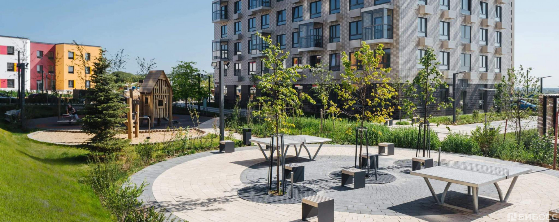 Чтобы жители квартала чувствовали простор и получали больше солнечного света, мы построим дома разной высоты. Во дворах появятся уютные парки с детскими площадками и местами для отдыха - здесь можно поболтать с соседями, почитать в тени или позаниматься йогой. Спортивные площадки мы разместим так, чтобы шум от них не мешал жителям.