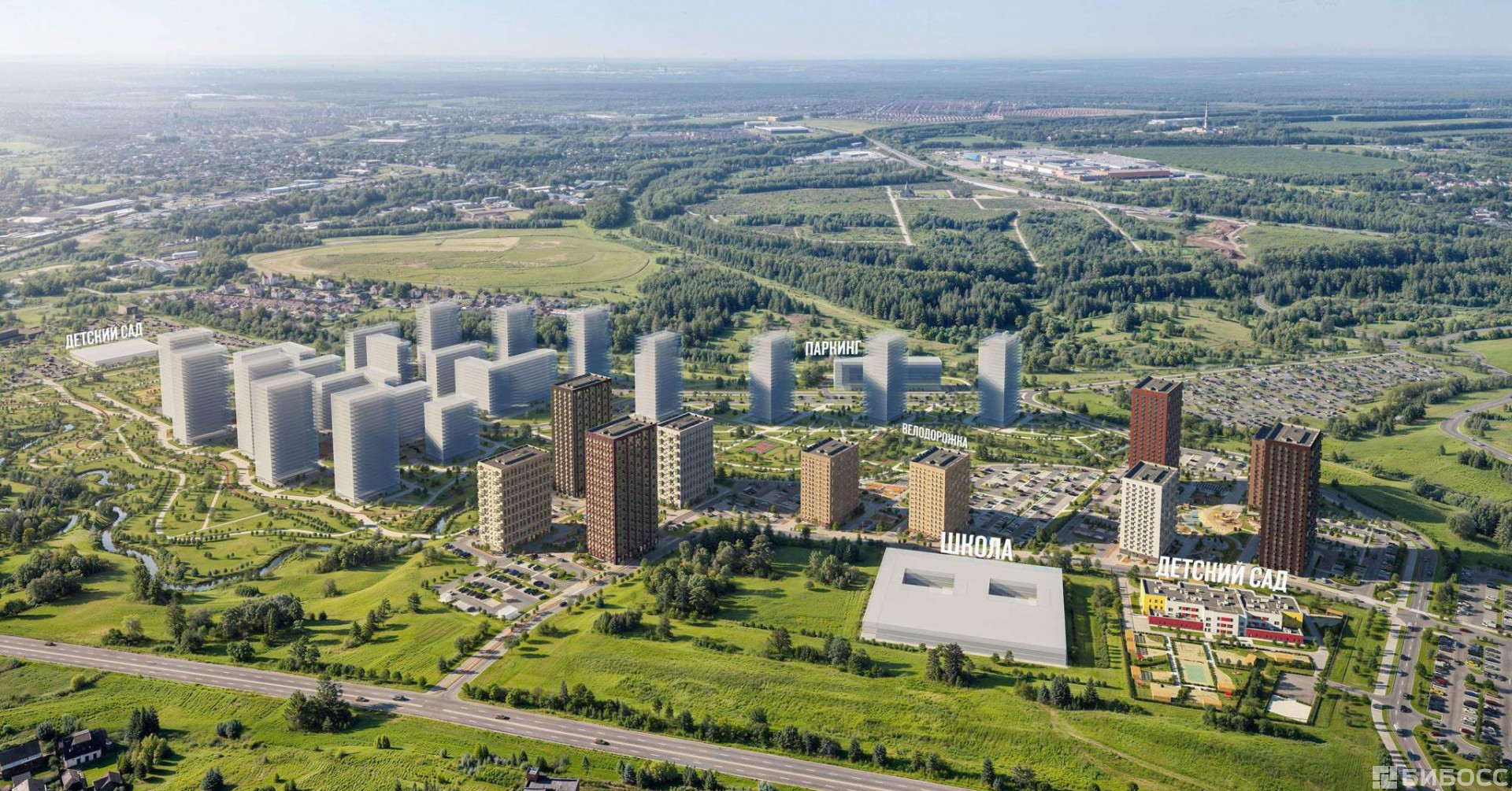 В этом проекте есть всё для комфортной жизни. Кроме жилых домов, проект включает два детских сада, один из которых уже строится, школу и многоуровневый надземный паркинг. На первых этажах откроются кафе, магазины и другие сервисы - чтобы купить кофе к завтраку или пиццу на ужин, можно будет просто спуститься на лифте. На подземном этаже появятся кладовые, в которых удобно хранить крупные и сезонные вещи.