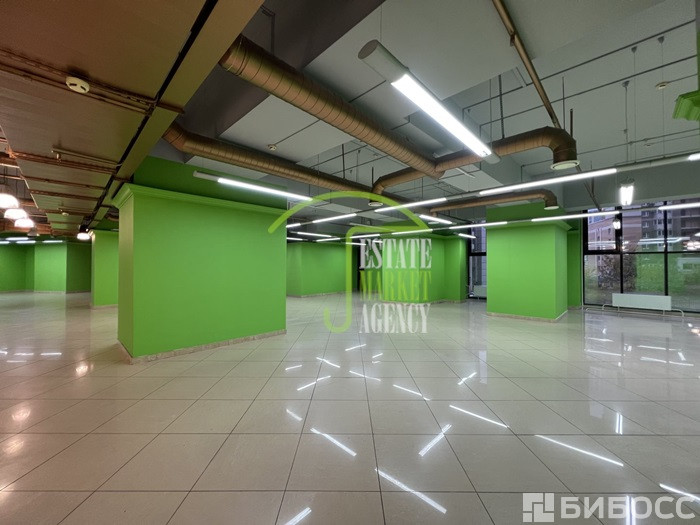 В помещении высокие потолки, несколько витринных окон.