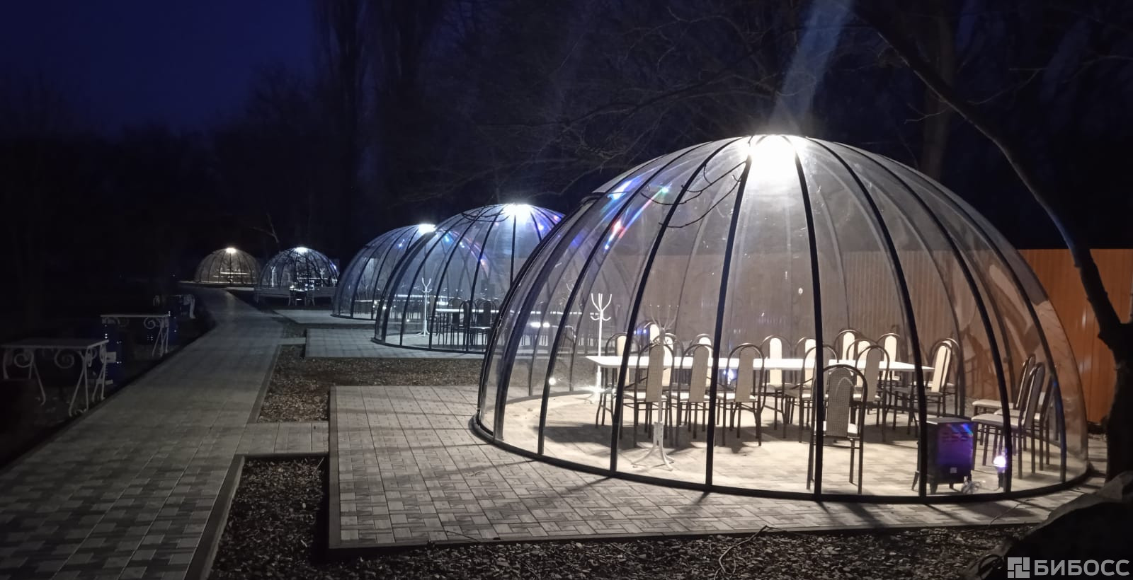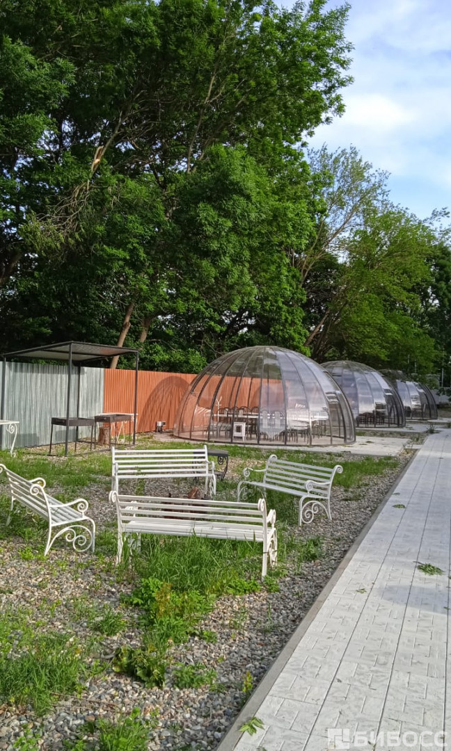 Первая очередь Глемпинг парк с купольными беседками на 200 посадочных мест. На территории 20 купольных беседок диаметром от 4 до 7 метров, вместимостью на 12, 18, 30, 70 человек.