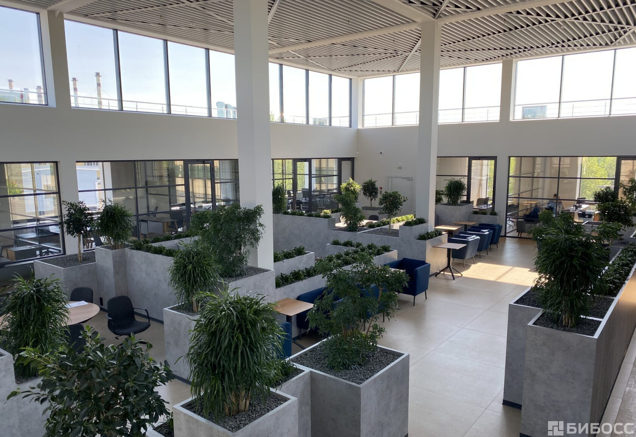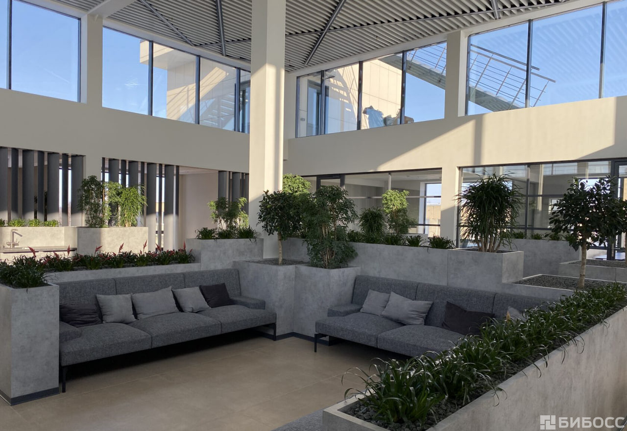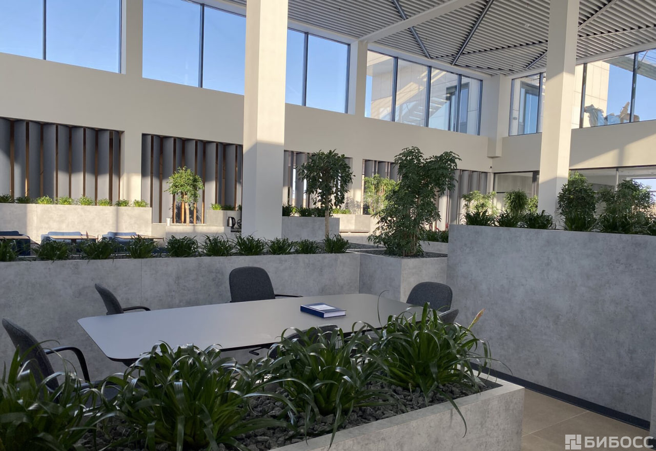 Лаунж-холл с панорамным остеклением и дизайнерским растительным ландшафтом наполнен естественным цветом и включает в себя зоны для переговоров и кофе-брейка.