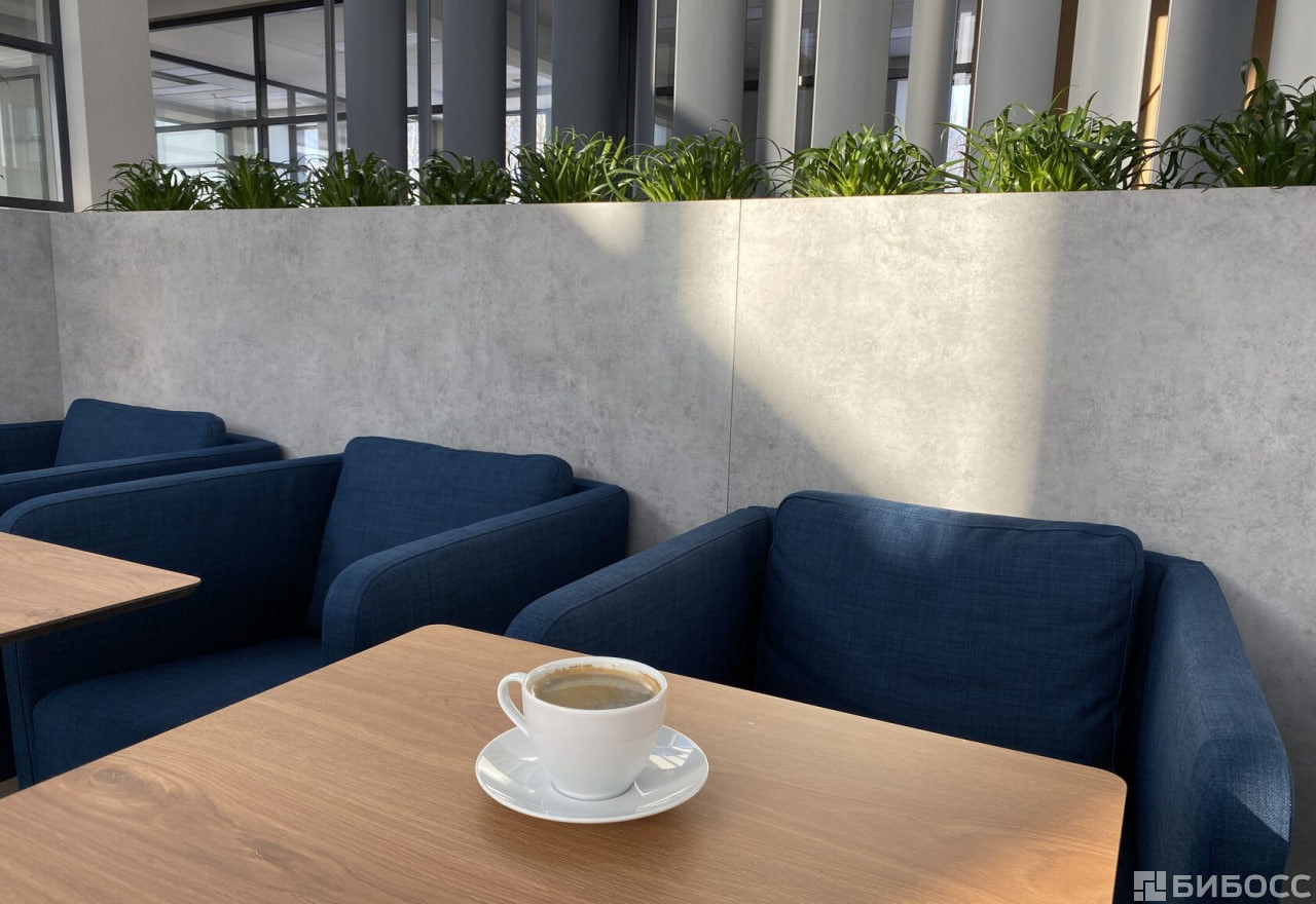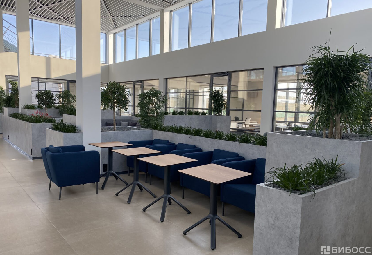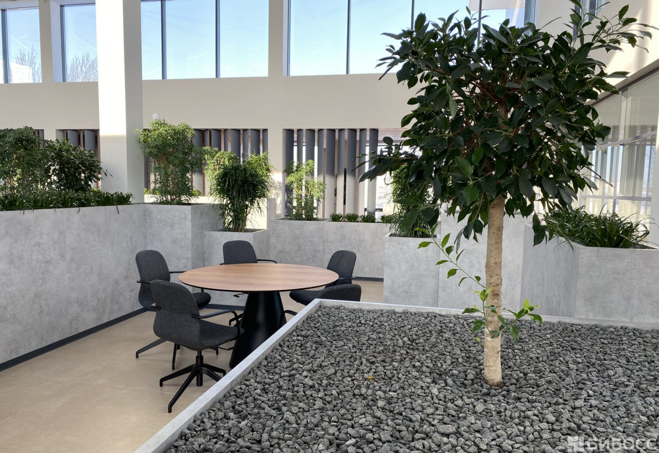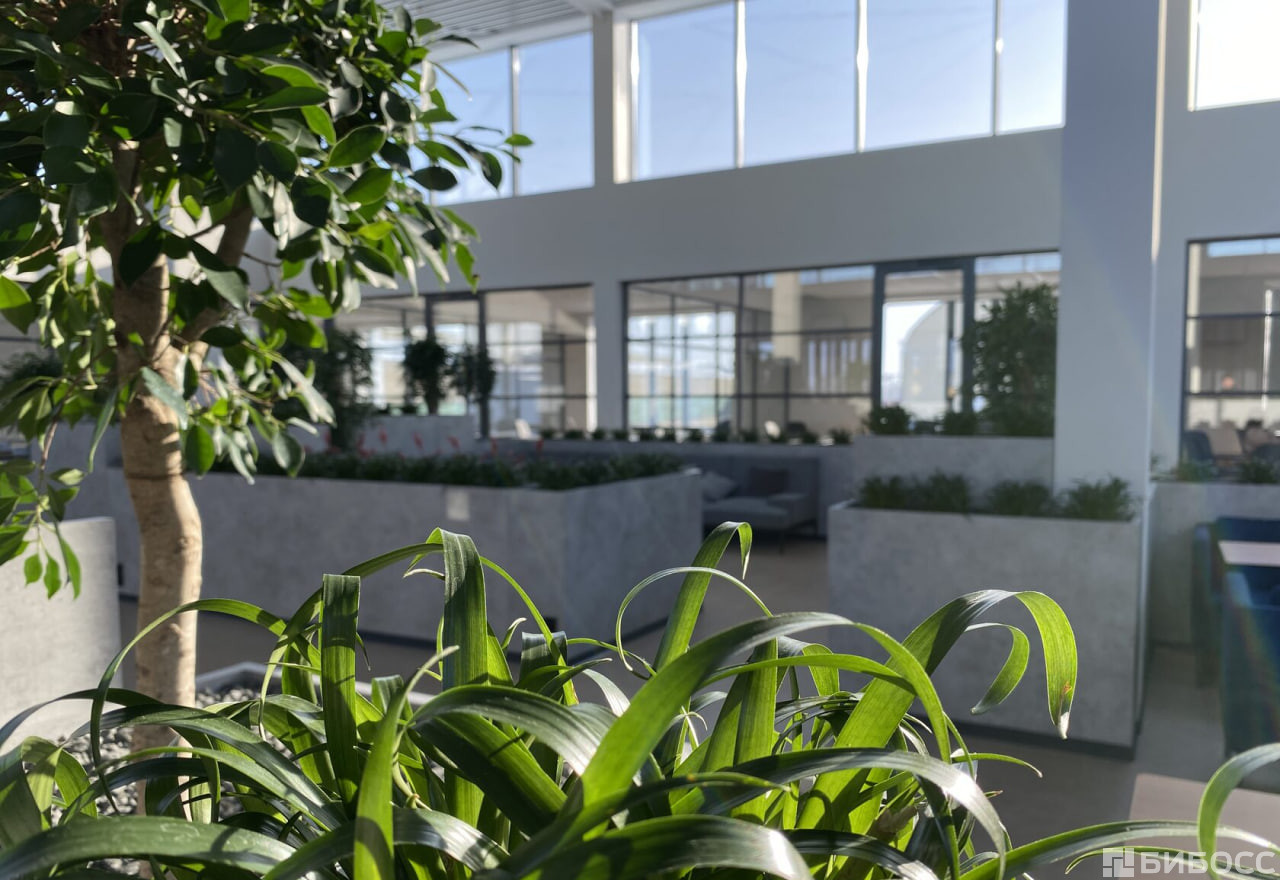 Лаунж-холл с панорамным остеклением и дизайнерским растительным ландшафтом наполнен естественным цветом и включает в себя зоны для переговоров и кофе-брейка.