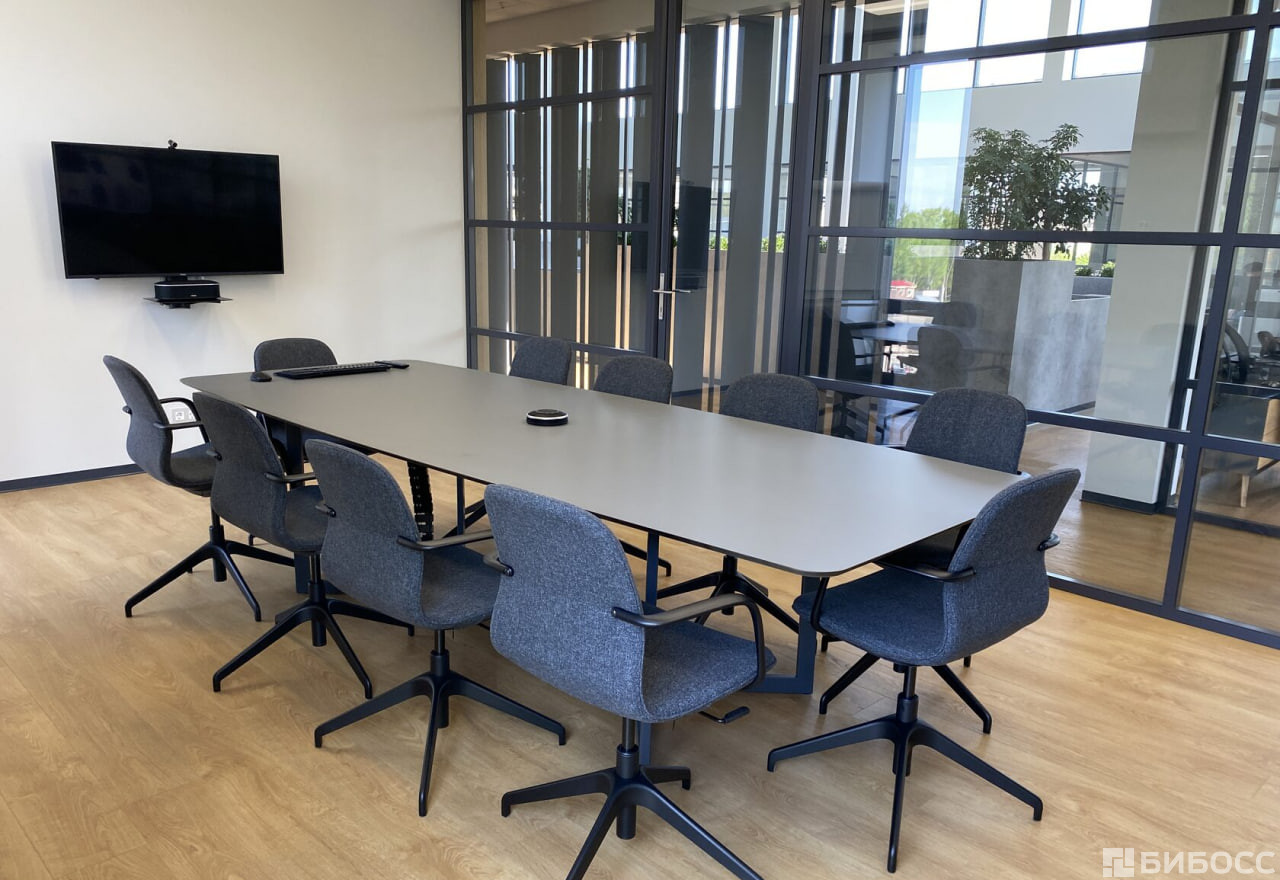 Закрытая переговорная комната оснащена оборудованием для видеоконференций.